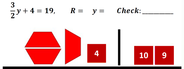 Unique to the Hands-On Equations Fractions approach, students solve first for the unit fraction of the unknown. Hence, for example, if the red block, representing a half of the unknown y, is found to have a value of 5, as in the above example, they realize that the yellow block, representing the unknown y, has a value of 10. This methodology provides students with a sense-making approach to fractional linear equations.